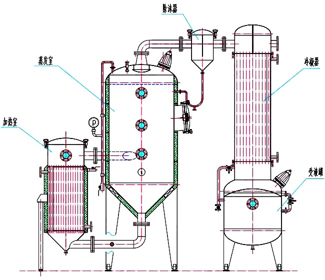 單效外循環(huán)真空濃縮器,由加熱器、蒸發(fā)器、除沫器、冷凝器、冷卻器、受液罐等組成,凡與物料接觸部件均采用優(yōu)質(zhì)不銹鋼制作,本設(shè)備