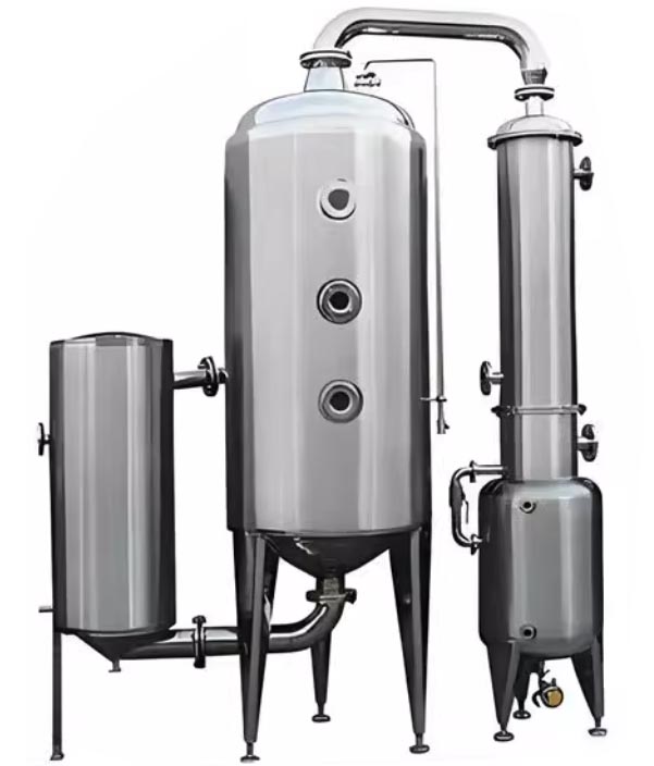 The single-effect external circulation vacuum concentrator consists of a heater, an evaporator, a demister, a condenser, a cooler, and a receiving tank. All components in direct contact with the material are made of high-quality stainless steel. This equipment
